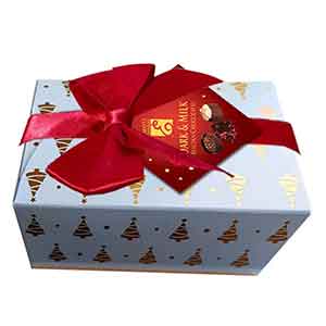 90 g Milk and Dark Chocolates A delectable array of milk & dark chocolates as well as white chocolate, blending velvety fillings that will knock your socks off! - Dark chocolate basket shape with a rich cream filling with a subtle touch of coffee, decorated with crushed cocoa beans - Dark chocolate baskets with nougat filling and crunchy chocolate balls. - Milk chocolate, soft caramel filling - Milk chocolate hearts with soft nougat filling - White chocolate, truffle filled with coconut cream, additionally decorated with coconut slivers. - Milk chocolate, with hazelnut cream and feuilletine. - Dark chocolate, soft caramel filling