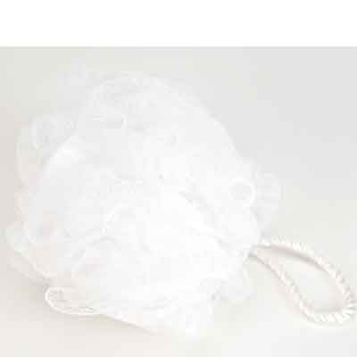 Mesh Sponge, white A black mesh sponge, with cord, works to gently loosen dead skin cells. Use in combination with bath gels or creams to form a particularly rich foam.