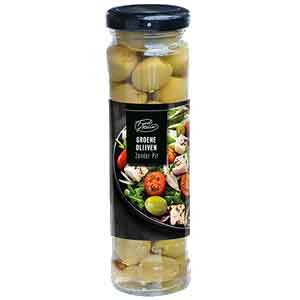 50 g grüne Oliven, ohne Kerne Green olives are a true staple of Mediterranean cuisine. Conveniently pitted and ready to enjoy, they are perfect as a side dish, in salads, on an antipasti platter, or simply as a savoury snack. With their distinctive flavour, they are not only delicious but also a wholesome addition to a balanced diet.