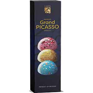78 g Grand Picasso ChocolatesGrand Picasso pralines combine exquisite ingredients and fine craftsmanship to create a truly special moment of indulgence. This exquisite selection combines melt-in-the-mouth milk chocolate with a variety of fillings. - Milk chocolates, two layers - apple caramel crumble and ganache with Apfelkorn and Calvados - Milk chocolates, with two layers - cranberry jam and white chocolate and yogurt ganache - Milk chocolates, with two layers - Orange blossom jam and white chocolate ganache with raspberries and roses